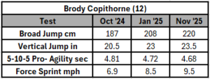 Brody has been working hard during this training sessions at Elite, and all of his hard work has been paying off. Check out his latest testing scores to see how much his metrics have improved since her first began training at Elite!