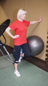 - Stand sideways about a foot from a wall on one leg, with your inside leg (wall side) bent at the knee. You may place your hand on the wall for balance
